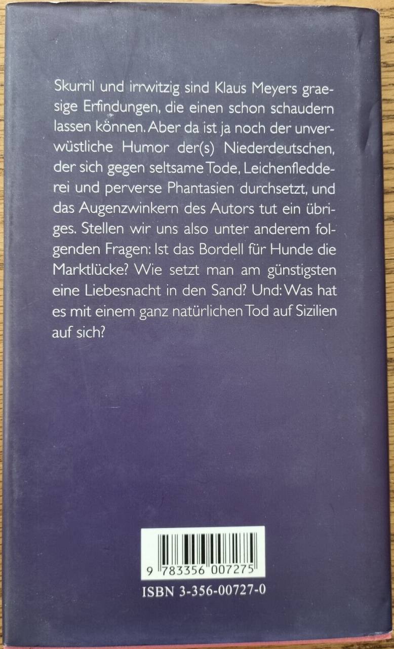 Skurril und irrwitzig sind Klaus Meyers graesige Erfindungen, die einen schon schaudern lassen können. Aber da ist ja noch der unverwüstliche Humor der(s) Niederdeutschen, der sich gegen seltsame Tode, Leichenfledderei und perverse Phantasien durchsetzt, und das Augenzwinkern des Autors tut ein übriges. Stellen wir uns also unter anderem folgenden Fragen: Ist das Bordell für Hunde die Marktlücke? Wie setzt man am günstigsten eine Liebesnacht in den Sand? Und: Was hat es mit einem ganz natürlichen Tod auf Sizilien auf sich?