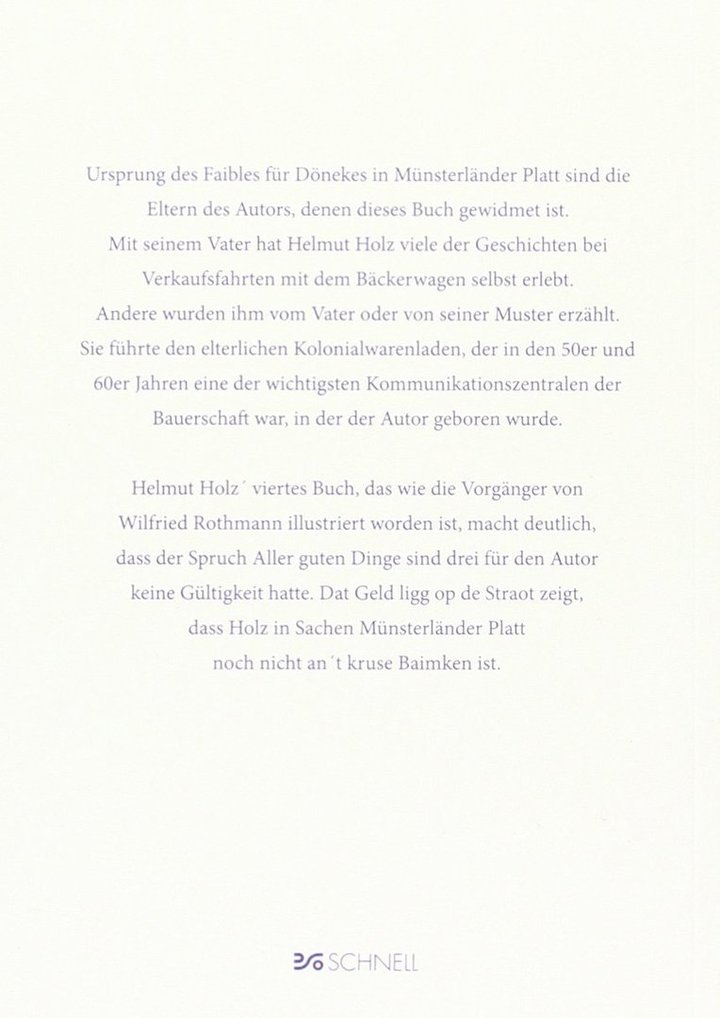Helmut Holz (Jahrgang 1941) ist gelernter Bäckermeister, schlug aber Anfang der 1970er Jahre einen ganz anderen Berufsweg ein und wurde Journalist. Von 1972 bis 1996 war er Sportredakteur in Gelsenkirchen. Ab 1974 bis Mitte der 1980er veröffentlichte die münsterländische Tageszeitung „Die Glocke“ die ersten plattdeutschen Kurzgeschichten, die der hauptberufliche Sportredakteur damals nur als Hobby schrieb. Nach seiner Pensionierung nahm er das frühere Hobby wieder auf. Seit 2009 sind im Schnell Verlag vier Bücher von Helmut Holz in Münsterländer Platt erschienen. Der Autor lebt im westfälischen Lünen.