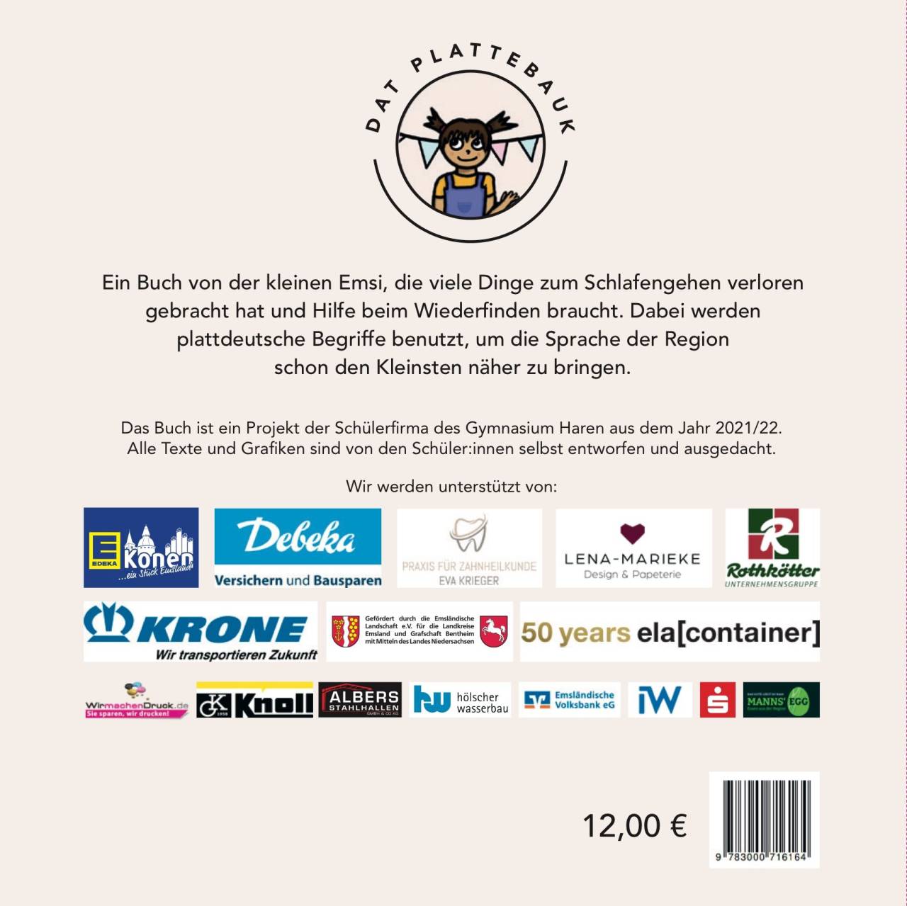 Ein Buch von der kleinen Emsi, die viele Dinge zum Schlafengehen verloren gebracht hat und Hilfe beim Wiederfinden braucht. Dabei werden plattdeutsche Begriffe benutzt, um die Sprache der Region um das Emsland schon den Kleinsten näher zu bringen.