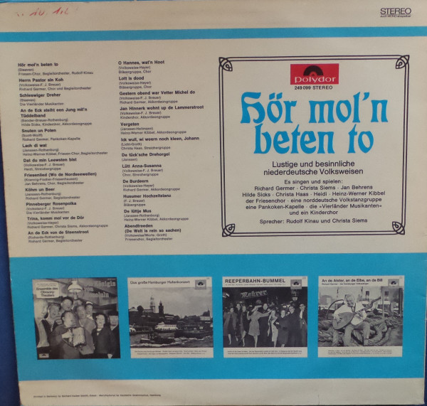 Es singen und spielen: Richard Germer, Christa Siems, Jan Behrens, Hilde Sicks, Christa Haas, Heidi, Heinz Werner Kibbel, der Friesenchor, eine norddeutsche Volkstanzgruppe, eine Pankoken-Kapelle, die Vierländer Musikanten und ein Kinderchor.
