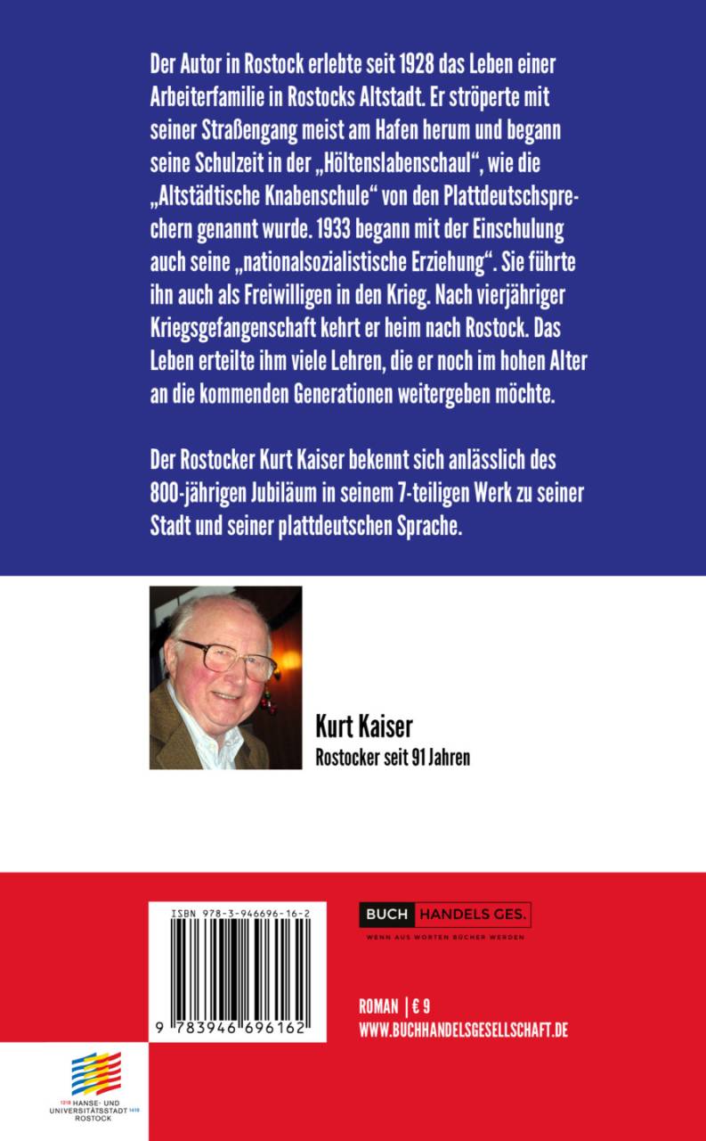 Der Autor in Rostock erlebte seit 1928 das Leben einer Arbeiterfamilie in Rostocks Altstadt. Er ströperte mit seiner Straßengang meist am Hafen herum und begann seine Schulzeit in der „Höltenslabenschaul“, wie die „Altstädtische Knabenschule“ von den Plattdeutschspre- chern genannt wurde. 1933 begann mit der Einschulung auch seine „nationalsozialistische Erziehung“. Sie führte ihn auch als Freiwilligen in den Krieg. Nach vierjähriger Kriegsgefangenschaft kehrt er heim nach Rostock. Das Leben erteilte ihm viele Lehren, die er noch im hohen Alter an die kommenden Generationen weitergeben möchte.