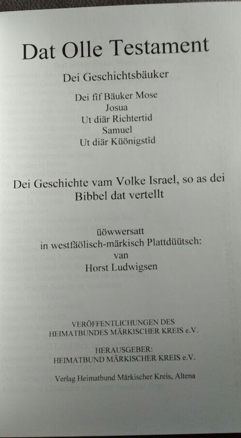 Dat Olle Testament: Dei Geschichtsbäuker: dei fif Bäuker Mose, Josua, ut diär Richtertid, Samuel, ut diär Küönigstîd; dei Geschichte vam Volke Israel, so as dei Bibbel dat vertellt; üöwwersatt in westfäölisch-miärkisch Plattdüütsch van Horst Ludwigsen