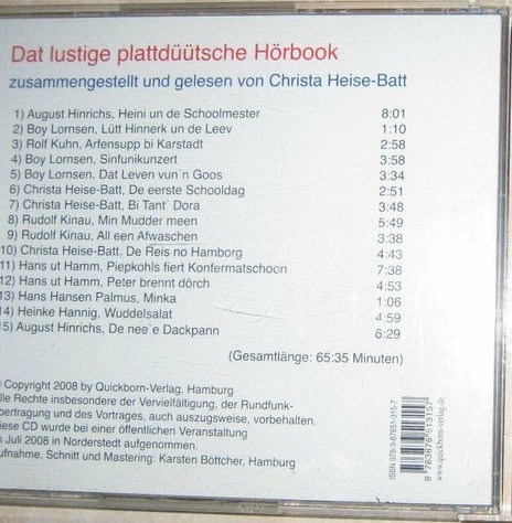 Christa Heise-Batt hat für diesen Live-Mitschnitt eine unterhaltsame Samlung von Texten aus der Welt des plattdeutschen Humors in seinen vielfältigen Spielarten in Szene gesetzt. Auf beeindruckende Weise versteht sie es durch ihre humorvolle Vortragskunst, ihre Zuhörer zu fesseln! Neben eigenen Texten hat Christa Heise-Batt Geschichten und Gedichte von Hans ut Hamm, Heinke Hannig, August Hinrichs, Rudolf Kinau, Rolf Kuhn, Boy Lornsen und Hans Hansen Palmus ausgewählt.
