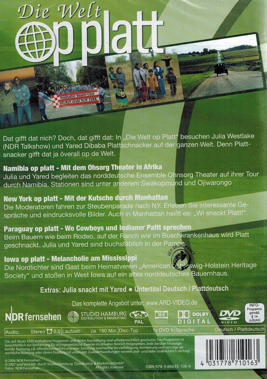 In "Die Welt op Platt" präsentieren Julia Westlake und Yared Dibaba Plattsnacker auf der ganzen Welt. Die DVD enthält 4 Folgen