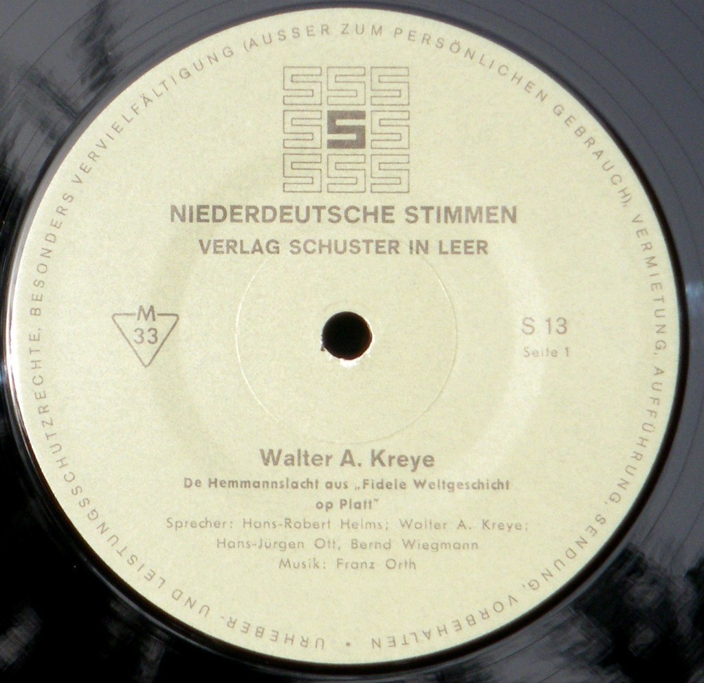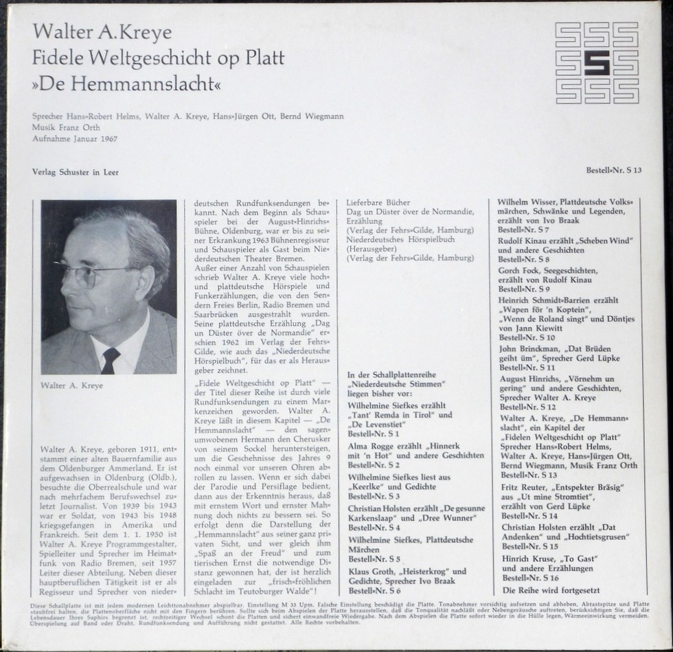 Fidele Weltgeschicht op Platt: De Hemmanslacht: Walther Arthur Kreye. Sprecher: Hans Robert Helms, Walter Arthur Kreye, Hans Jürgen Ott, Bernd Wiegmann. Musik Franz Orth [vielm. Ort]
