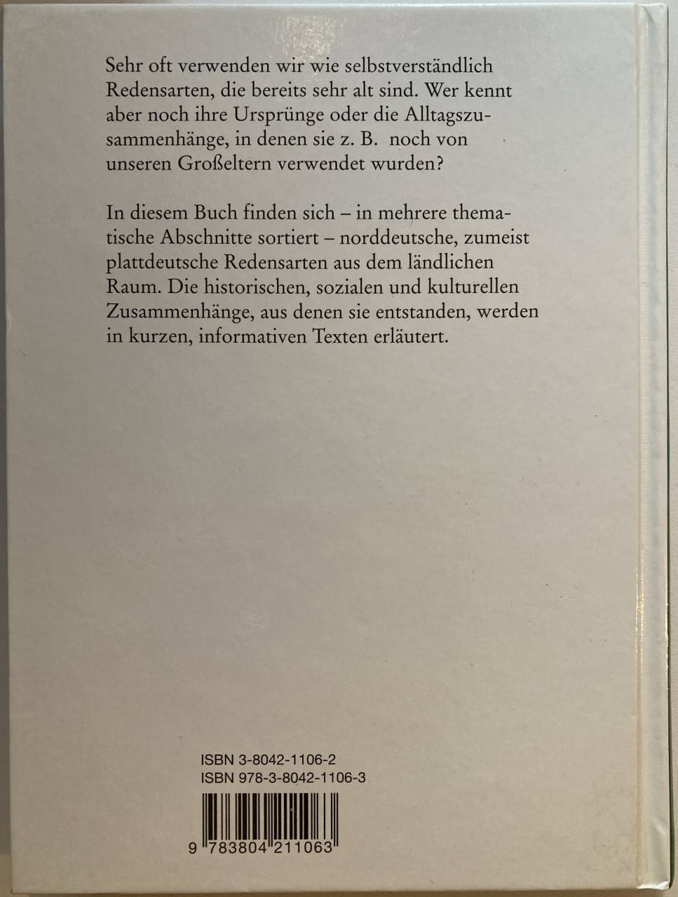In diesem Buch finden sich - in mehrere thematische Abschnitte sortiert - norddeutsche, zumeist plattdeutsche Redensarten aus dem ländlichen Raum. Die historischen, sozialen und kulturellen Zusammenhänge, aus denen sie entstanden, werden in kurzen, informativen Texten erläutert.