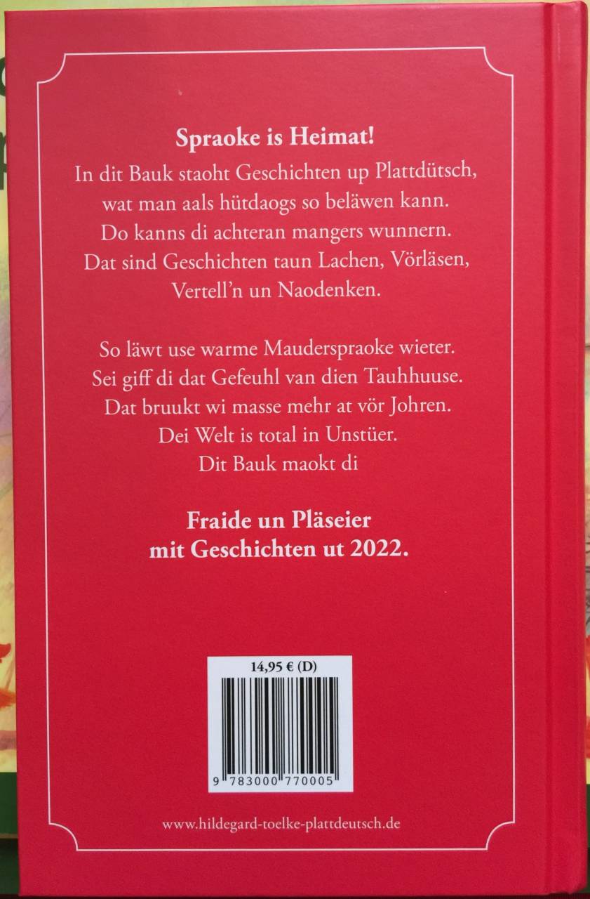 So läwt use warme Mauderspraoke wieter. Sei giff di dat Gefeuhl van dien Tauhhuuse. Dat bruukt wi masse mehr at vör Johren. Dei Welt is total in Unstüer. Dit Bauk maokt di Fraide un Pläseier mit Geschichten ut 2022.