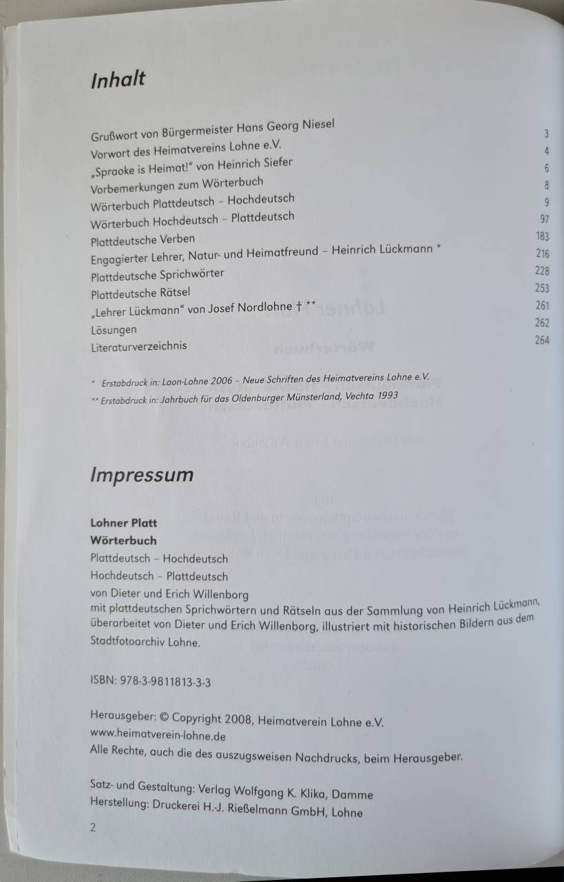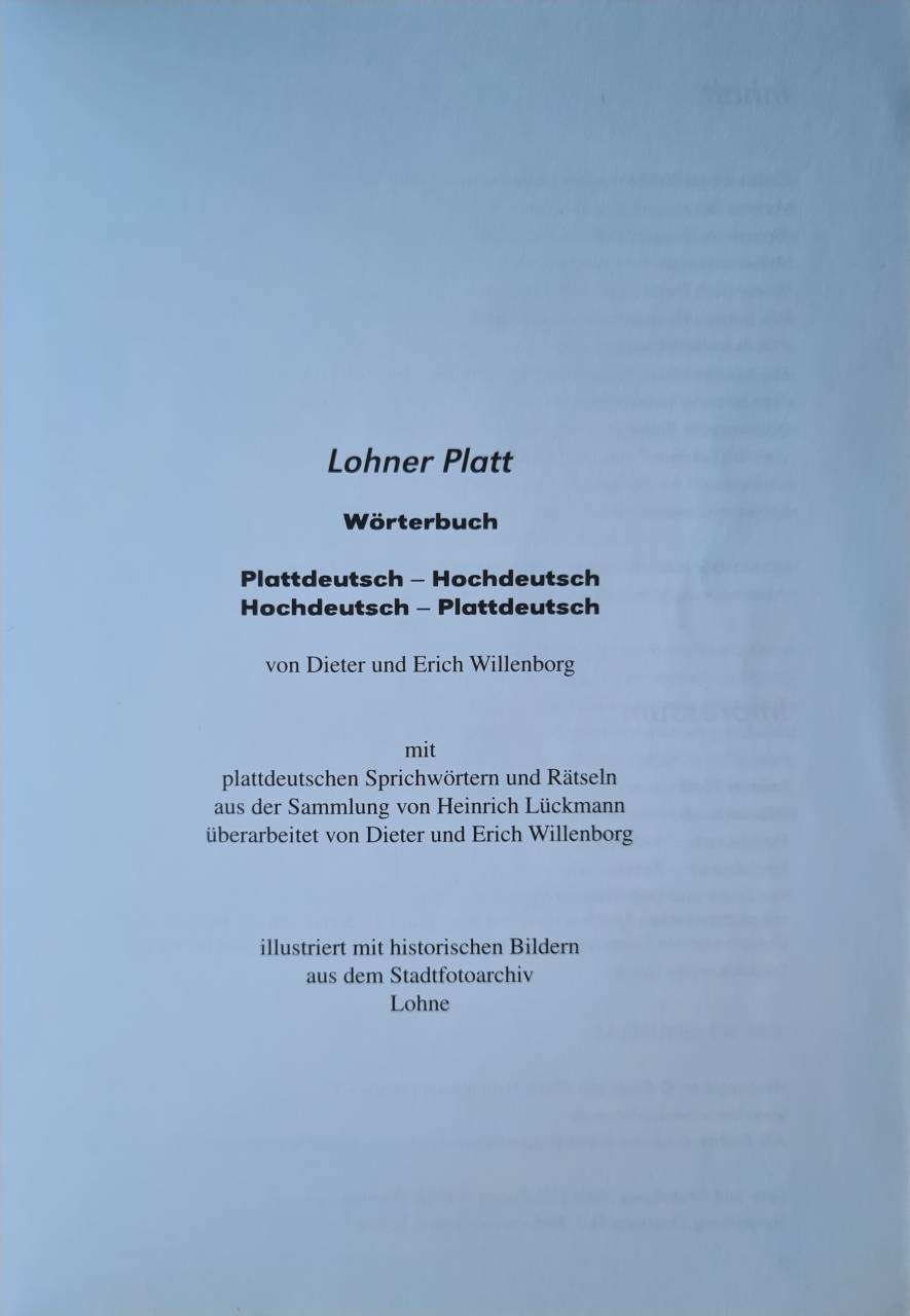Lohner Platt: Wörterbuch; Plattdeutsch-Hochdeutsch, Hochdeutsch-Plattdeutsch: von Dieter und Erich Willenborg. Mit plattdeutschen Sprichwörtern und Rätseln aus der Sammlung von Heinrich Lückmann überarb. von Dieter und Erich Willenborg. Ill. mit historischen Bildern aus dem Stadtfotoarchiv Lohne
