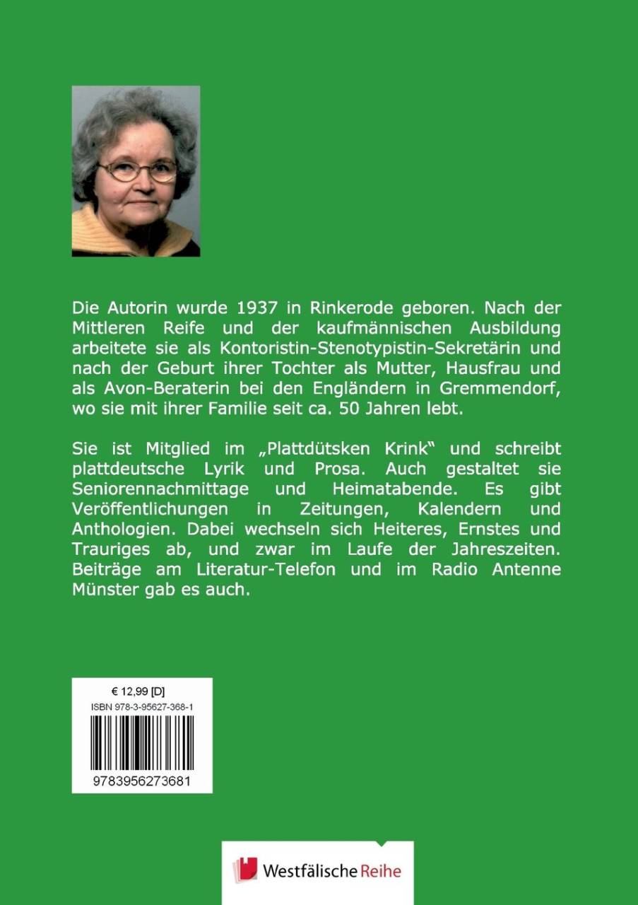 Die Autorin wurde 1937 in Rinkerode geboren. Nach der Mittleren Reife und der kaufmännischen Ausbildung arbeitete sie als Kontoristin-Stenotypistin-Sekretärin und nach der Geburt ihrer Tochter als Mutter, Hausfrau und als Avon-Beraterin bei den Engländern in Gremmendorf, wo sie mit ihrer Familie seit ca. 50 Jahren lebt.