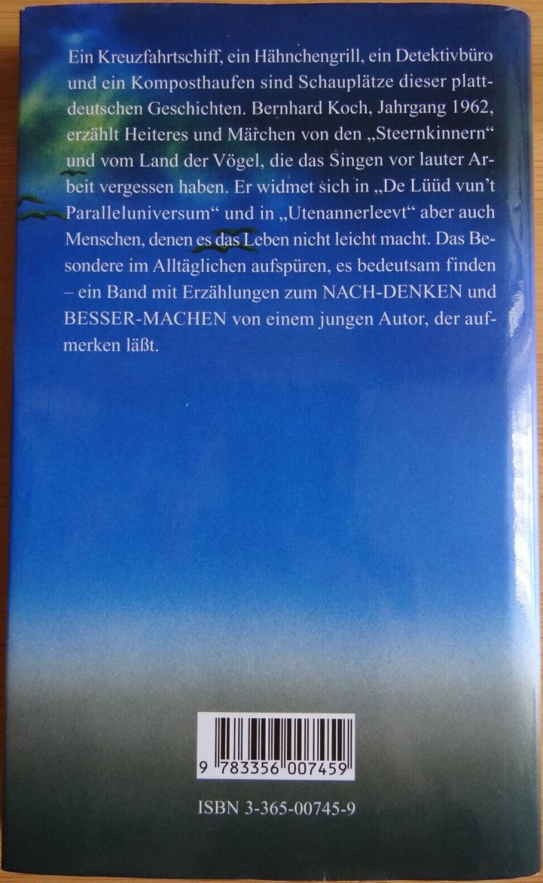 Ein Kreuzfahrtschiff, ein Hähnchengrill, ein Detektivbüro und ein Komposthaufen sind Schauplätze dieser plattdeutschen Geschichten. Bernhard Koch, Jahrgang 1962, erzählt Heiteres und Märchen von den "Steernkinnern" und vom Land der Vögel, die das Singen vor lauter Arbeit vergessen haben. Er widmet sich in "De Lüüd vun't Paralleluniversum" und in "Utenannerleevt" aber auch Menschen, denen es das Leben nicht leicht macht. Das Besondere im Alltäglichen aufspüren, es bedeutsam finden - ein Band mit Erzählungen zum Nachdenken und Bessermachen.