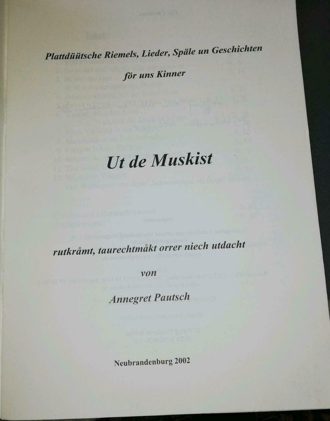 Ut de Muskist: Plattdüütsche Riemels, Lieder, Späle un Geschichten för uns Kinner: [Hrsg.: Landesheimatverband Mecklenburg-Vorpommern e.V.]. Rutkråmt, taurechtmåkt orrer niech utdacht von Annegret Pautsch