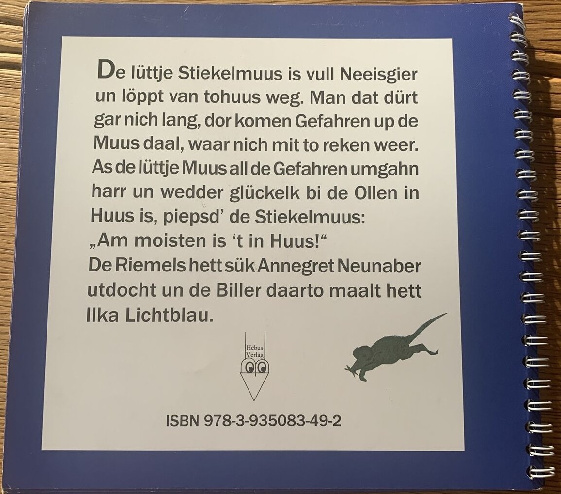 De lüttje Stiekelmuus is vull Neeisgier un löppt van tohuus weg. Man dat dürt gar nich lang, dor kommen Gefahren up de Muus daal, waar nich mit to reken weer. As de lüttje Muus all de Gefahren umgahn harr un wedder glückelk bi de Ollen in Huus is, piepsd’ de Stiekelmuus: „Am moisten is ’t in Huus!“