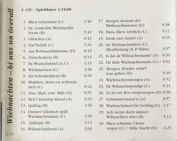 Das Beste was die niederdeutsche Literatur aus dem 19. und 20. Jahrhundert rund um das Thema „Weihnachten“ aufzuweisen hat, ist auf dieser CD versammelt: Gedichte und Geschichten, die das Herz erwärmen. Die wunderbaren Weihnachtstexte von John Brinckman, Berthold Brügge, Dietrich Dahl, Hans-Peter Hahn, Gerd Lüpke, Fritz Meyer-Scharffenberg, Fritz Reuter und anderen werden von Traute und Dietrich Dahl und Hans-Peter Hahn gelesen, Musik zur Gitarre: Wolfgang Schmiedt.