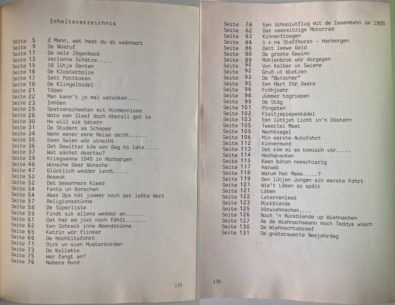 mit Geschichten von Hermann Claus, Willi Dohemann, Hanna Grundmann, Marie-Luise Hoppe, Ernst Horstmann, Inge Klußmann, Friedrich Lüdeke, Heinrich Lüdeke, Eleonore Meyer, Uwe Noormann, Heinrich Peek-Ruge, Grete Sieling, Adele Thiermann un Elfriede Thies