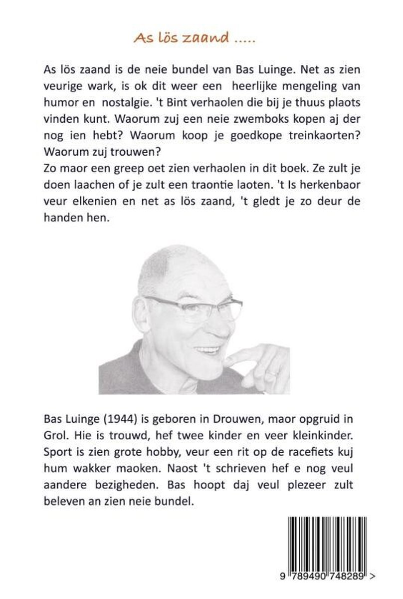 Net as zien veurige wark, is ok dit weer een heerlijke mengeling van humor en nostalgie. 't Bint verhaolen die bij je thuus plaots vinden kunt. Waorum zuj een neie zwemboks kopen aj der nog ien hebt oet de jaoren zestig? Waorum koop je goedkope treinkaorten? Waorum zuj trouwen? Zo maor een greep oet zien verhaolen in dit boek. Ze zult je doen laachen of je zult een traontie laoten. 't Is herkenbaor veur elkenien en net as lös zaand, 't gledt je zo deur de handen hen.