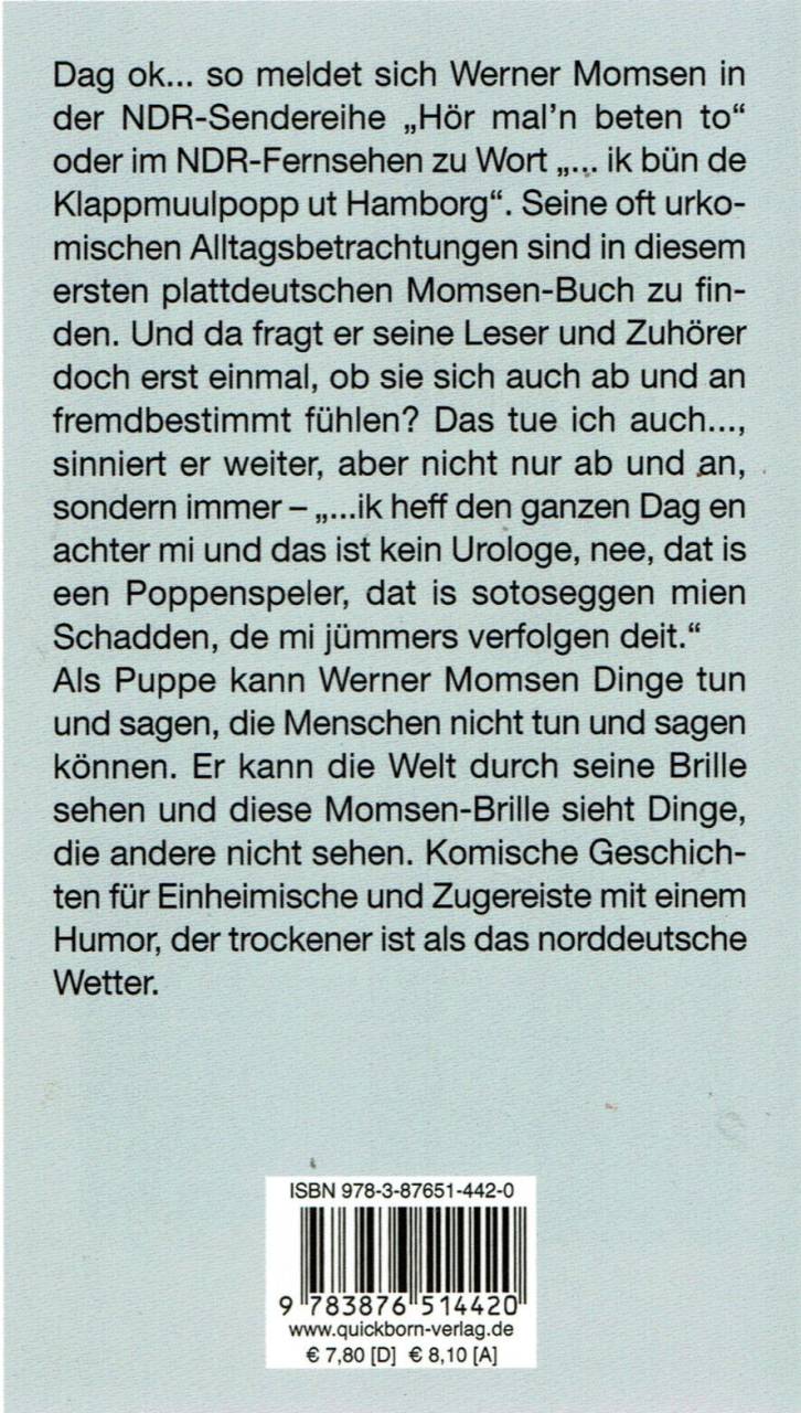 Dag ok... so meldet sich Werner Momsen in der NDR-Sendereihe „Hör mal`n beten to“ oder im NDR-Fernsehen zu Wort... ik bün de Klappmuulpopp. Seine oft urkomischen Alltagsbetrachtungen sind in diesem ersten plattdeutschen Momsen-Buch zu finden. Und da fragt er seine Leser und Zuhörer doch erst einmal, ob sie sich auch ab und an fremdbestimmt fühlen? Das tue ich auch, sinniert er weiter, aber nicht nur ab und an, sondern immer – ik heff den ganzen Dag en achter mi und das ist kein Urologe, nee, dat is een Poppenspeler, dat is sotoseggen mien Schadden, de mi jümmers verfolgen deit.