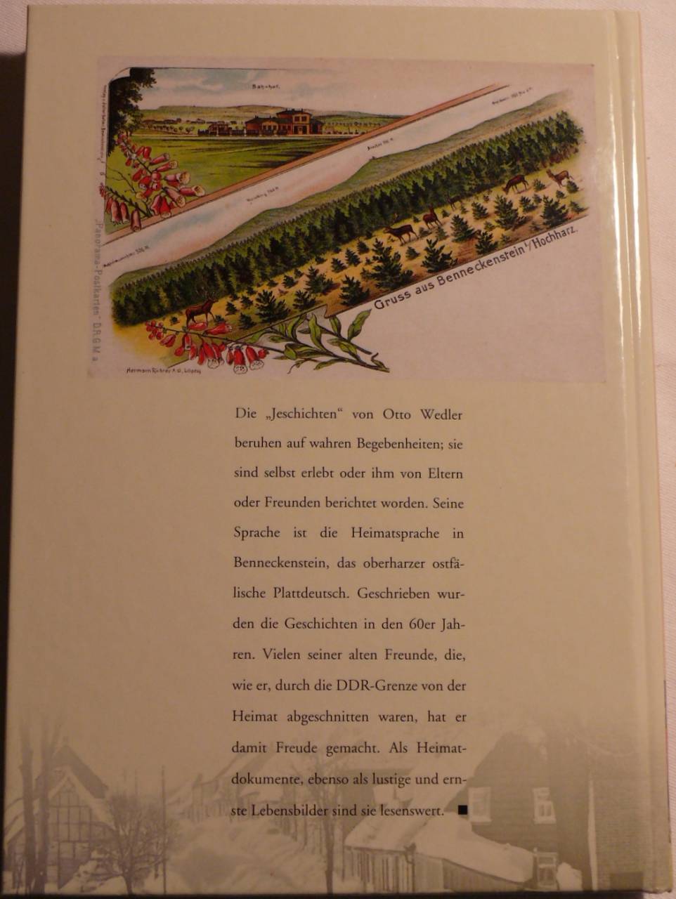 Die „Jeschichten“ von Otto Wedler beruhen auf wahren Begebenheiten; sie sind selbst erlebt oder ihm von Eltern oder Freunden berichtet worden. Seine Sprache ist die Heimatsprache in Benneckenstein, das oberharzer ostfälische Plattdeutsch. Geschrieben wurden die Geschichten in den 60er Jah-en. Vielen seiner alten Freunde, die, wie er, durch die DDR-Grenze von der Heimat abgeschnitten waren, hat er damit Freude gemacht. Als Heimatdokumente, ebenso als lustige und ernste Lebensbilder sind sie lesenwert.