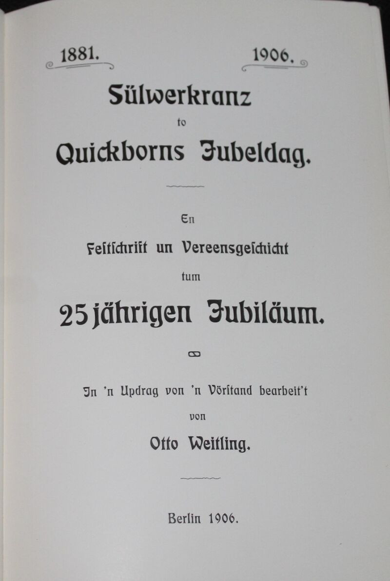 Sülwerkranz to Quickborns Jubeldag: En Festschrift un Vereensgeschicht tum 25jährigen Jubiläum: In ’n Updrag von ’n Vörstand bearb. von Otto Weitling