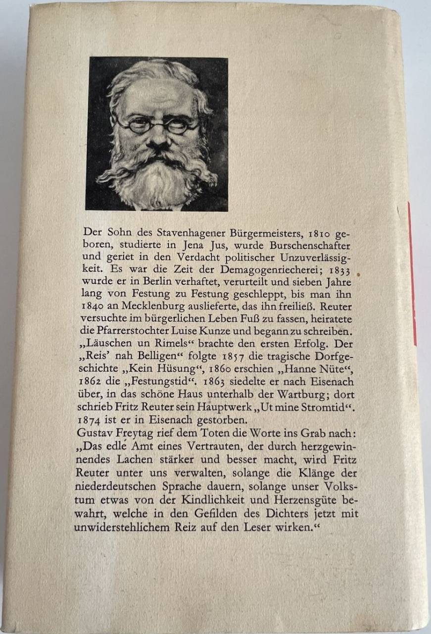 „Läuschen un Rimels“ brachte den ersten Erfolg. Der „Reis’ nah Belligen“ folgte 1857 die tragische Dorfgeschichte „Kein Hüsung“, 1860 erschien „Hanne Nüte“, 1862 die „Festungstid“. 1863 siedelte er nach Eisenach über, in das schöne Haus unterhalb der Wartburg; dort schrieb Fritz Reuter sein Hauptwerk „Ut mine Stromtid“.
