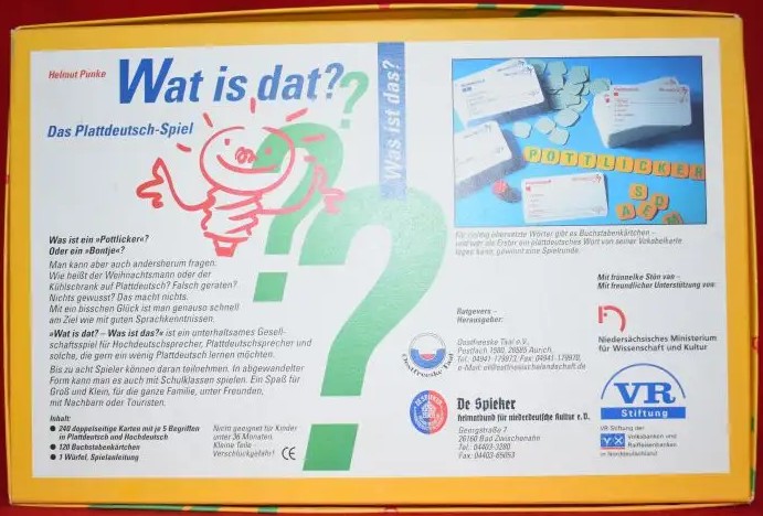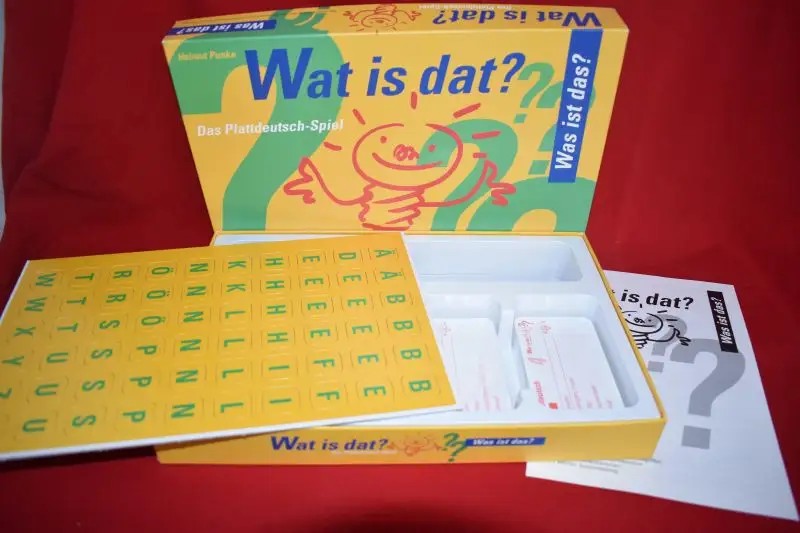 240 Woordkorten hooch- un plattdüütsch, 120 Bookstavenkoorten, 1 Würfel, 1 Anleitung; för 2-8 Spelers af 8 Johr